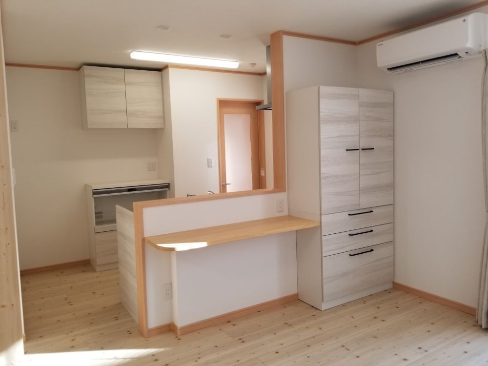 S様邸 category:新築 DK 猫とくらす家猫ちゃんがお外を見られるようにとのことで、窓に猫ちゃんが座れるスペースを。吹き抜けは猫ちゃんがのぞける小窓。階段下は猫ちゃんトイレスペース。 リビング LD 洋室 猫ちゃん小窓 吹き抜け 客間 階段
